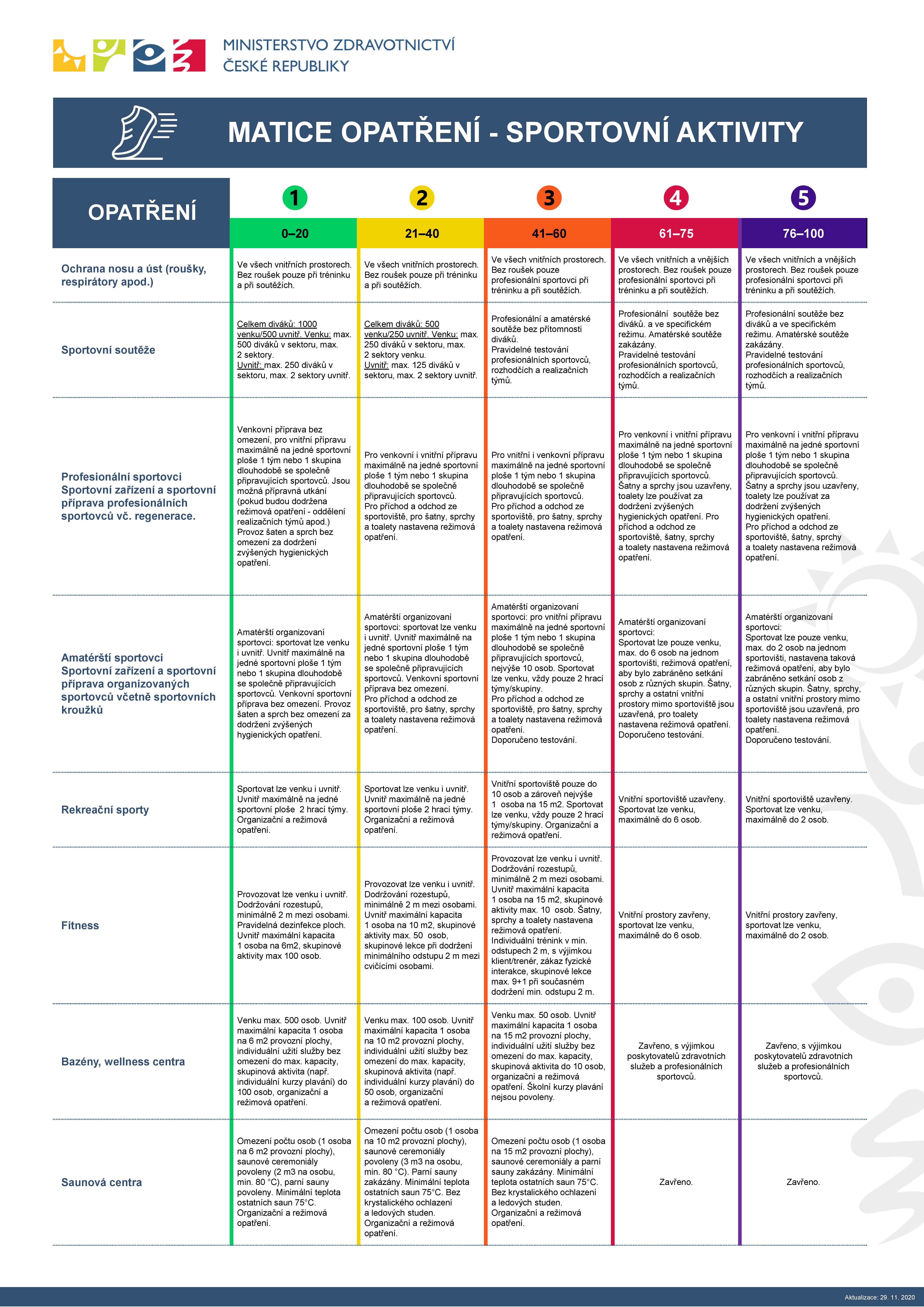 Z AKTUÁLNÍ COVID SITUACE4) V rámci trénování na sportovištích konstatuji, že stále platí tabulka covid sport, kterou přikládám v příloze; FAČR dělá maximum pro to, aby se amatérské soutěže v ročníku 2020/21 mohly dohrát. Snažíme se apelovat na všechny zainteresované státní subjekty, které mohou pomoci s restartem výkonnostního sportu, aby v tomto smyslu v kooperaci se sportovními svazy aktivně a bez odkladu konaly.