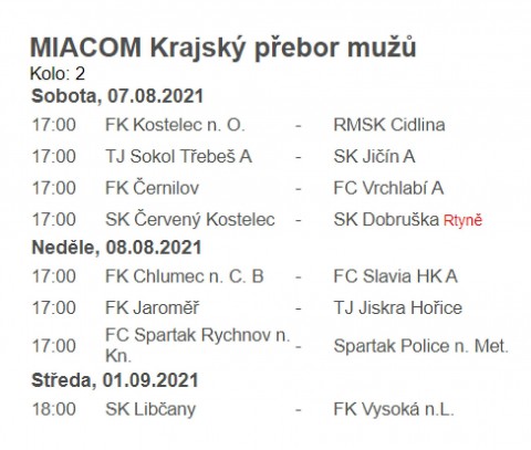 V nejvyšší krajské soutěži "MIACOM Krajský přebor mužů" se odehraje o tomto víkendu sedm zápasů, dohrávka mezi SK Libčany a Vysokou nad Labem je pak na programu 1.9.2021.