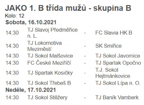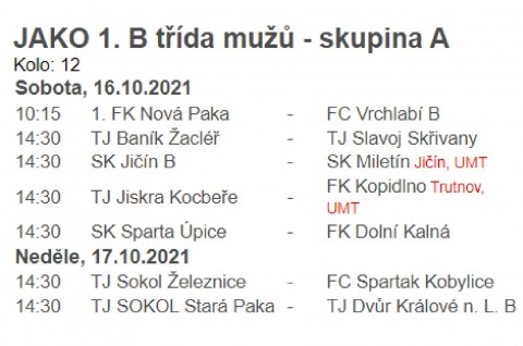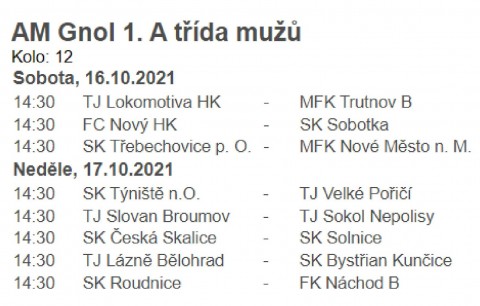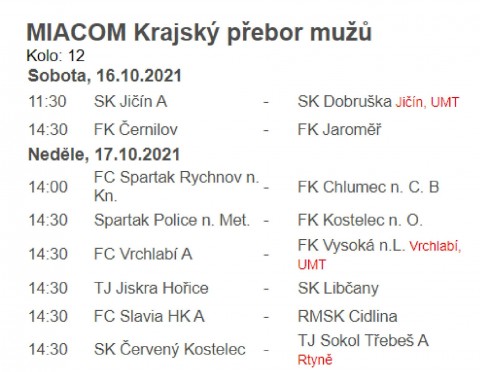 Nejvyšší krajská soutěž ,,MIACOM Krajský přebor dospělých" odehraje své 12. kolo. V