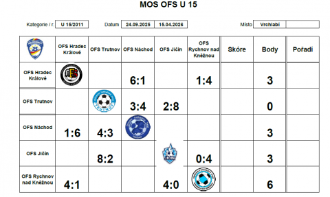Výsledky turnaje MOS okresních výběrů U15 - PODZIMNÍ ČÁST hraném ve středu 24.9.2025 ve Vrchlabí.